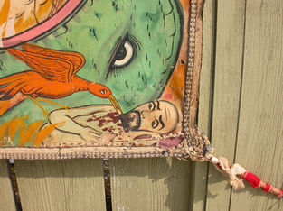 Background: Pardeh painting is narrative and epic. Originating from popular Iranian painting, the art flourished during the Constitutional Revolution of Iran.The oldest were said to date from the beginning of the nineteenth century, rooted in the narrative traditions and Persian passion plays common in old Iranian coffeehouses. These religious paintings are a collection of images of the leaders and elders of the Shi'a sect and scenes from the battles of the prophet Muhammad, Imam Ali, the Karbala tragedy and other religious folk-tales. The paintings are traditionally described by a narrator known as naghal (“relater”) who sometimes performed outside the coffeehouses, moving to a public square or the entrance to the bazaar for a broader audience that included women and children. For these street performances the paintings were rendered on loose canvas, called a pardeh, or screen. A curtain would veil the image until the storyteller dramatically flipped it over the back to announce the beginning of his tale.